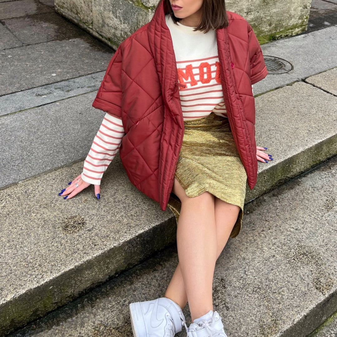 La jupe JEDEN incarne l'élégance dorée, offrant une touche étincelante à votre routine quotidienne. Sa coupe cache-cœur, son délicat nœud et la subtile fente ajoutent une sophistication moderne sans effort. Pour une sortie décontractée, associez-la à un joli pull comme le AMOUR et à une veste ou doudoune telle que la ELISA, complétant le look avec une paire de baskets. Cette pièce polyvalente est le choix parfait pour illuminer vos journées avec style, prouvant que le doré peut être intégré harmonieusement dans votre quotidien.