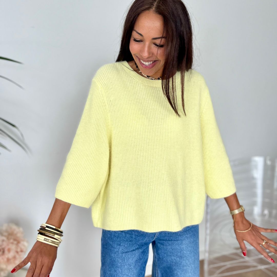 Il présente une coupe fluide avec des manches trois-quarts, offrant une silhouette élégante et décontractée. Son col rond ajoute une touche classique, tandis que la maille côtelée apporte du relief. Il s’adapte parfaitement à toutes les morphologies.