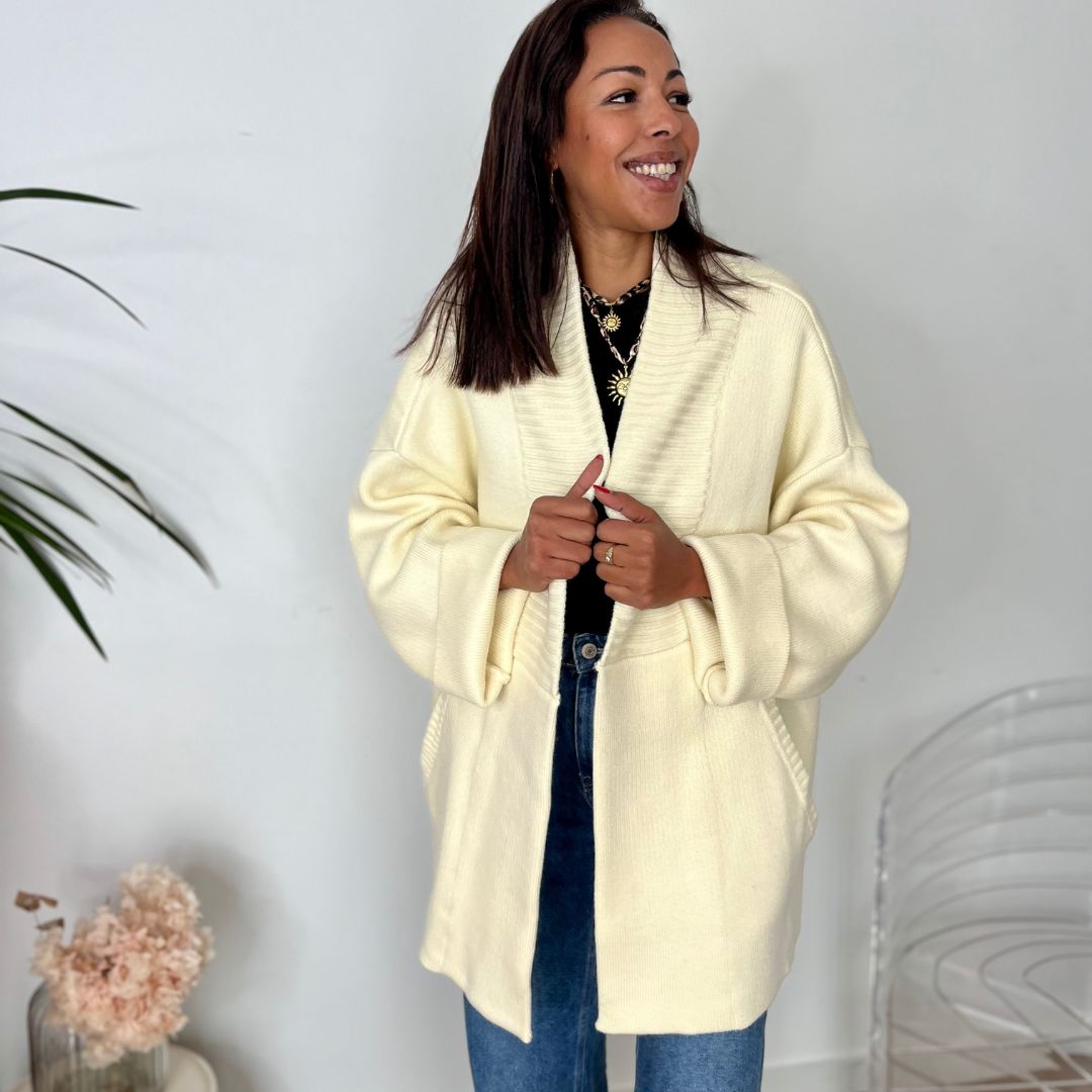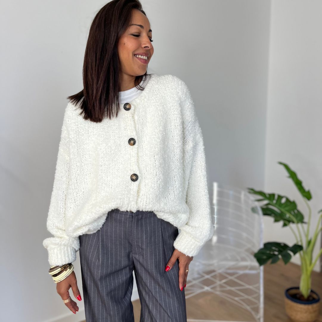 Le gilet GISÈLE se distingue par sa coupe oversize, idéale pour une silhouette décontractée mais élégante. Ses manches longues avec revers et son col rond apportent une touche de modernité. Il se ferme par des boutons, ajoutant un détail raffiné.