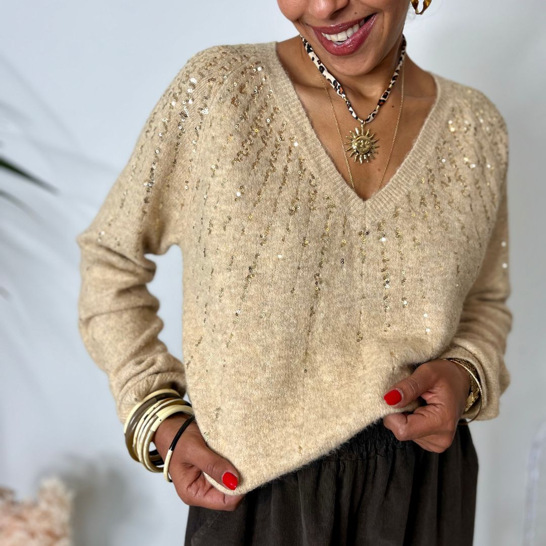 Le pull KIM se prête à toutes les occasions. Associez-le à un pantalon habillé pour une journée au bureau ou à un jean pour un look décontracté. Ses sequins dorés apportent une élégance discrète à toutes vos tenues.