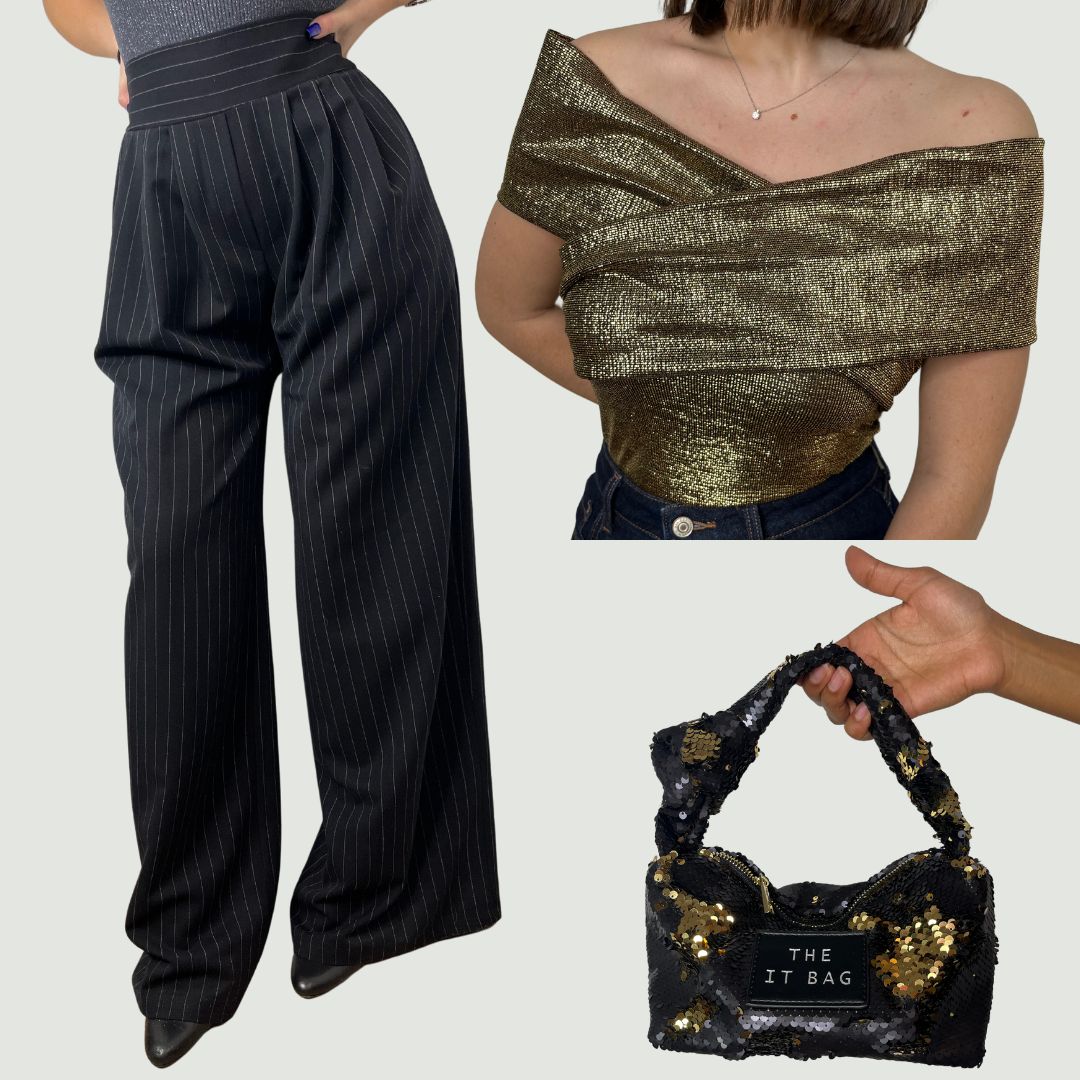 Misez sur l'élégance intemporelle avec le pantalon tailleur NAVY bleu marine. Sa taille haute, sa coupe large et ses pinces subtiles ajoutent une touche sophistiquée. Les deux poches à l'avant apportent une touche pratique et décontractée. Associez-le au body YOLY doré pour un ensemble à couper le souffle. Les bretelles croisées et la teinte dorée du body créent une allure saisissante et élégante. Pour accessoiriser le look, vous pouvez ajouter à votre tenue notre sac à sequins TAYLOR qui apportera une touche supplémentaire de paillettes et de style. Ce look est un choix parfait pour celles qui veulent allier style et confort pendant les fêtes.